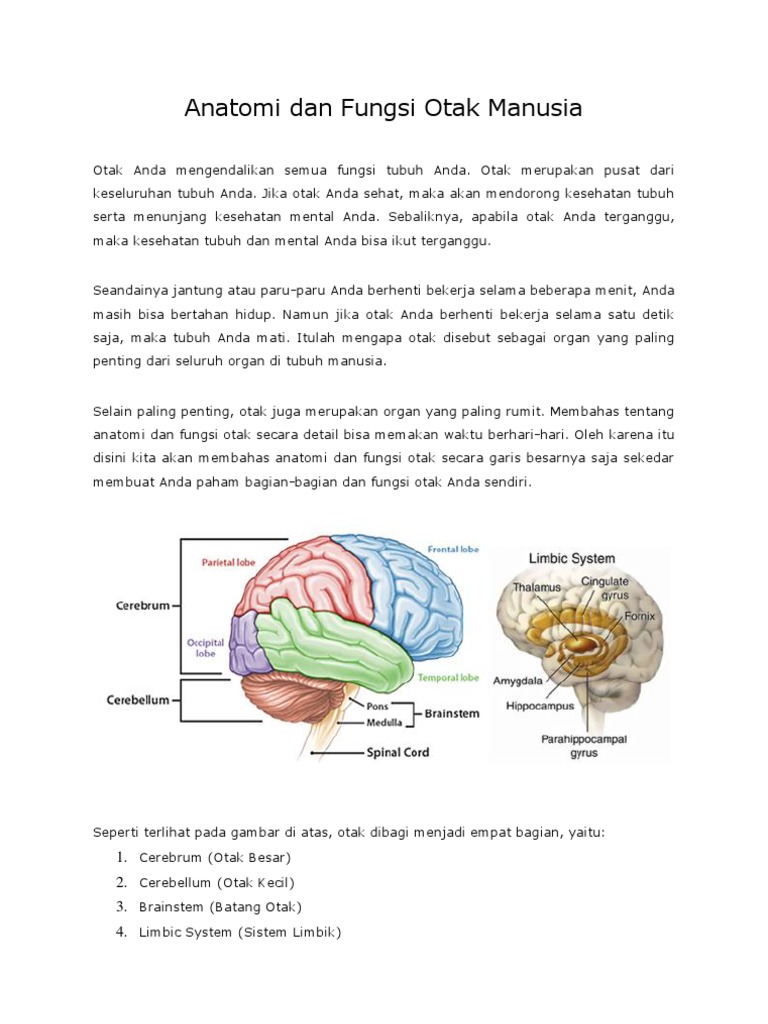 Bagian otak dan fungsinya cukup vital bagi kelangsungan hidup manusia. Cerebrum (otak besar) cerebellum (otak kecil) brainstem (batang otak) limbic system (sistem limbik). Download & view anatomi otak as pdf for free. Meninges adalah selubung pelindung yang mengelilingi otak dan sumsum tulang belakang. Otak adalah benda putih yg lunak terdapat di dalam rongga tengkorak yg menjadi pusat saraf cerebellum, fungsi dan pengantar anatomi.